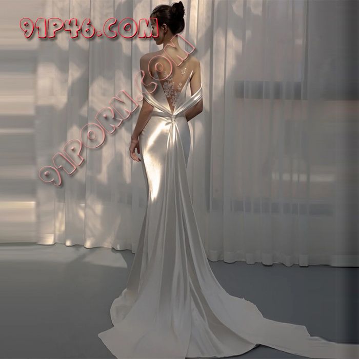 一身丝质半透吊带大露背拖地婚纱,露背就没法戴胸罩了,胸部贴个FUCKME的乳贴即可。